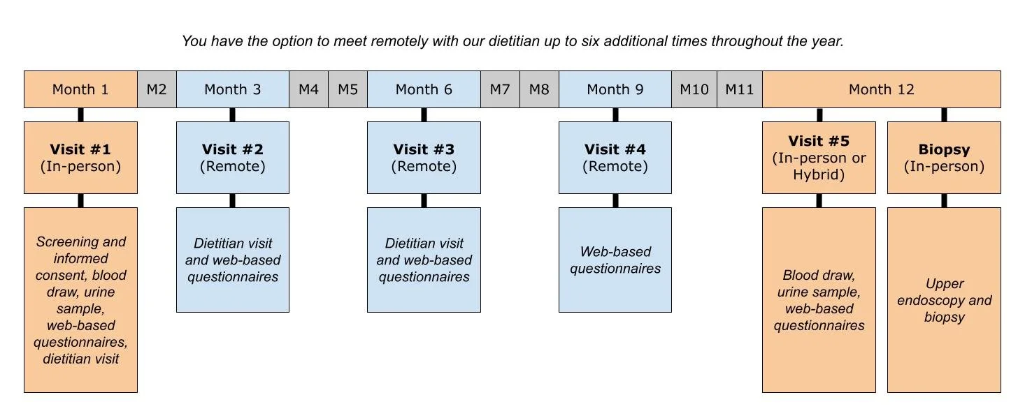 You will have the following procedures done as part of the study: blood draw, urine sample, endoscopy with biopsy of the small intestine, questionnaires, meetings with the dietitian, and (if you are assigned to the standard-of-care plus technology group) use of gluten detection technology.